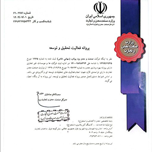 - دارای بالاترین سطح گواهی فنی مالیاز وزارت صنعت، معدن و تجارت
