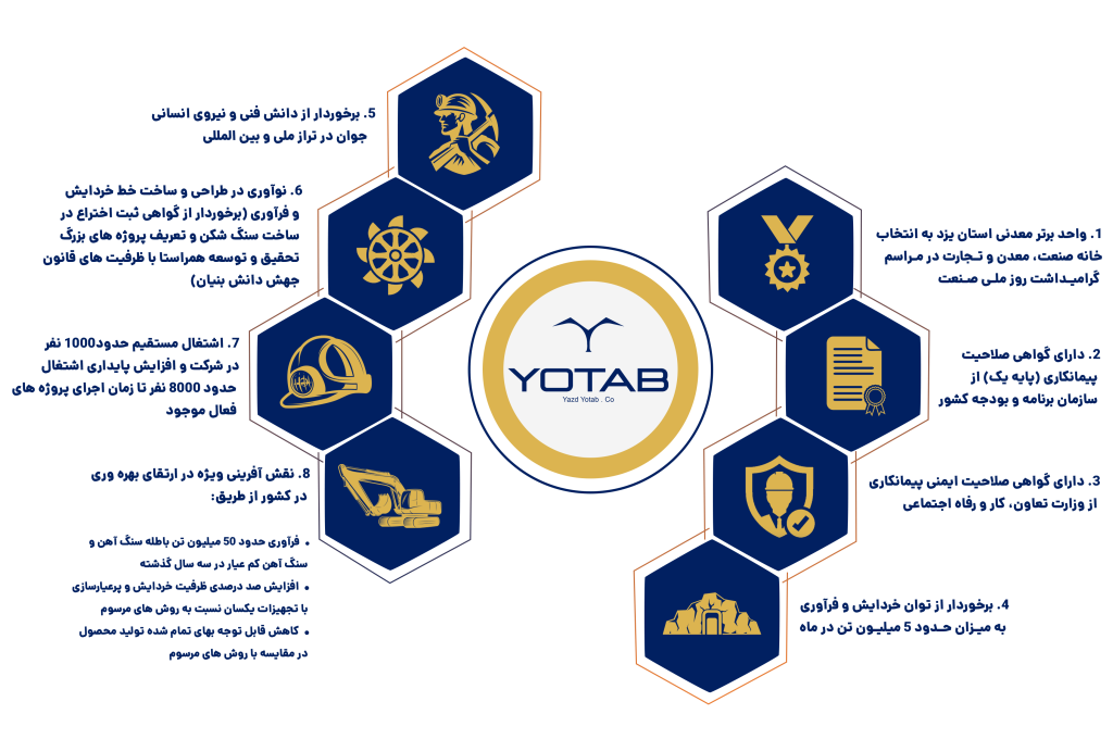 هسته اصلی شرکت صنعت و معدن یزد یوتاب به همت رییس فعلی این شرکت از سال ۱۳۸۷ در پروژه های مختلف خردایش و پرعیارسازی سنگ آهن شکل گرفت. در آن زمان سید ابوالفضل یزدی با همت شرکا توانست طراحی جدید و منحصر به فردی از چیدمان تجهیزات خردایش و پرعیارسازی را به این صنعت عرضه نماید. این طراحی منحصر بفرد منجر به افزایش ظرفیت خردایش تا ۵ برابر معمول با تجهیزات یکسان شد که برای اولین بار در کشور دستیابی به چنین ظرفیت خردایشی با تجهیزات معمول به وقوع پیوست.
